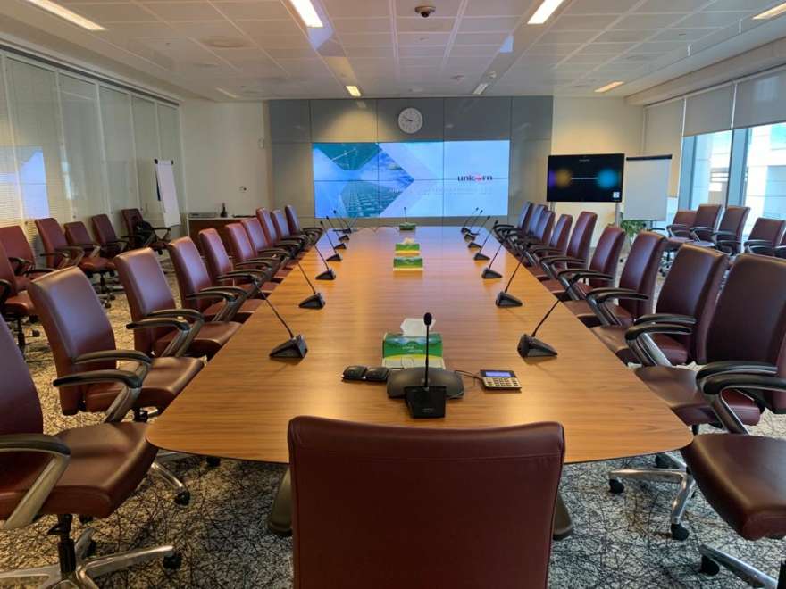 The solution Unicorn opted for comprises Taiden’s HCS-5300MC/80 main unit connected with a single HCS-5380C_B digital IR wireless chairman unit and 15 HCS-5380D_B delegate units. A pair of Taiden HCS-5300CHG/08 charging units capable of accommodating up to eight devices at a time are also present, together with a pair of wall-mounted HCS-5300TD_S/80 infrared receivers. Joining the Taiden solution is a Mipro ACT-32HC wireless microphone system.