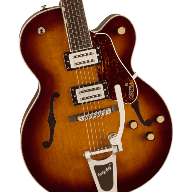 The G2420T Streamliner Hollow Body Single-Cut with Bigsby is designed for the modern guitarist who yearns for something beyond the norm. A commanding guitar for powerful players, the G2420T's modern sonics, updated electronics and authentically elegant style create the latest iteration of That Great Gretsch Sound!