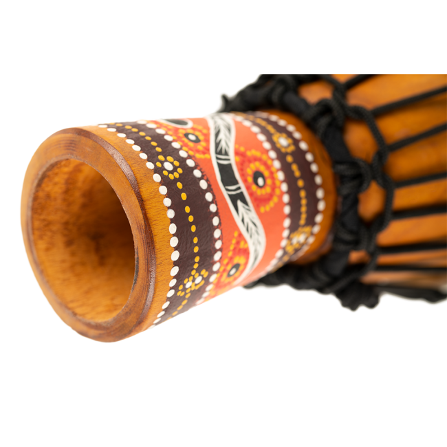 The African Style Mini Djembes are carved from one solid piece of plantation grown Mahogany. They feauture a decorative exquisite dot-painted exterior, all done by hand. The size makes them great for enjoying playing at home or joining in with a drum circle. These high quality djembes are fitted with hand selected goat heads and nylon tuning ropes to provide outstanding sound.