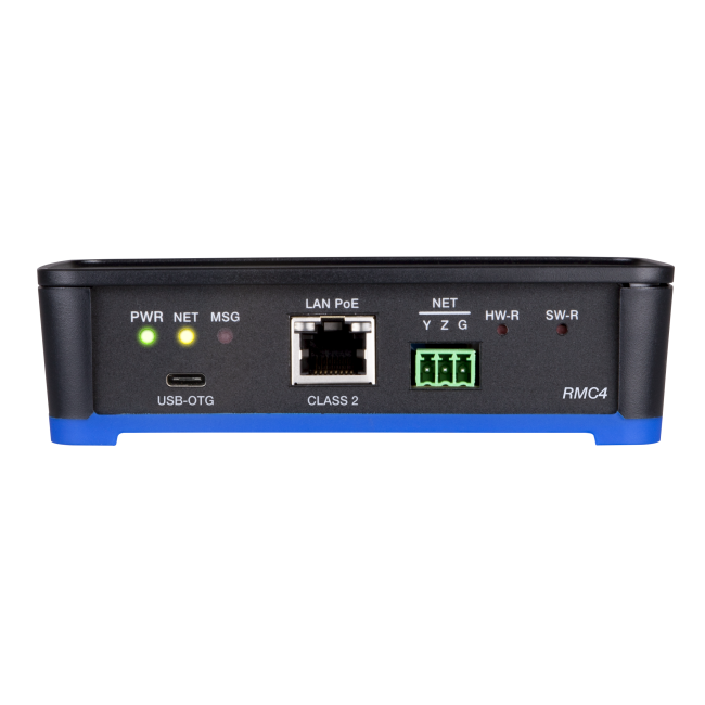 The Crestron® RMC4 provides a secure, high‑performance, cost-effective control processor and interface for controlling and monitoring for a single display device, a small AV system, lighting and shading, climate control, security, energy management, and many other specialized applications. A small form factor allows the RMC4 to be placed just about anywhere, with the option to attach it to a flat surface or DIN rail using the included mounting bracket. The RMC4 can fit easily behind a video display or above a projector, and provides enough control ports to control the display device along with a screen or lift.